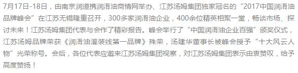 由江蘇湯姆集團獨家冠名的“2017年中國潤滑油品牌峰會(無錫)”圓滿結束
